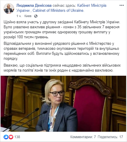"...Каждый из 35 освобожденных 7 сентября украинских граждан получит единовременную денежную выплату в размере 100 000 гривен. Ответственным за выполнение правительственного решения является Министерство по делам ветеранов, временно оккупированных территорий и внутренне перемещенных лиц... Считаю, что социальная поддержка недавно освобожденных военных моряков и политзаключенных и их семей чрезвычайно важна", - написала она.