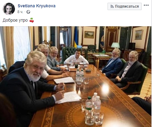 Журналист Светлана Крюкова запостила фотожабу, на которой все присутствующие на встрече, кроме Зеленского, заменены на Коломойского. Намекая на доминирующую роль олигарха в окружении Зе.