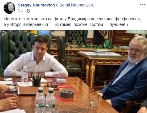Блогер Сергей Наумович тоже намекает на статусность Коломойского: "Мало кто заметил, что на фото у Владимира пепельница фарфоровая, а у Игоря Валерьевича – из камня, похоже. Гостям – лучшее!"