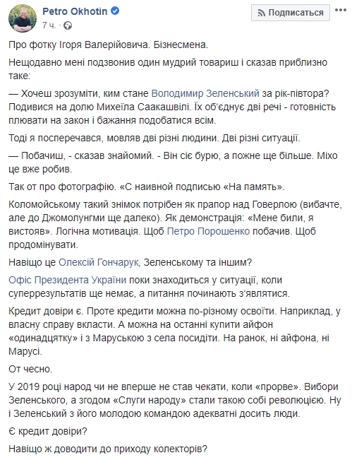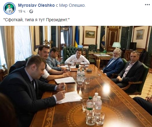 Известный порохобот Мирослав Олешко сопроводил фотографию подписью: "Сфоткай, типа я тут президент". Намекая на то, что "истинный президент" тут – Коломойский.