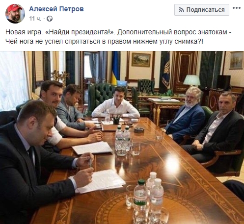 Еще один сторонник Порошенко Алексей Петров пошутил в том же стиле: "Новая игра. "Найди президента!". Дополнительный вопрос знатокам – Чей нога не успел спрятаться в правом нижнем углу снимка?!"