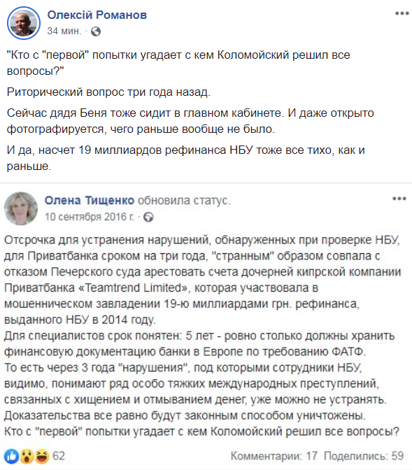 А юрист Алексей Романов в связи с этим фото напоминает о масштабе вопросов, которые Коломойский недавно решил для себя через НБУ. Речь о рефинансировании на 19 миллиардов гривень для ПриватБанка в 2014 году и о заморозке расследования по этому факту сегодня.