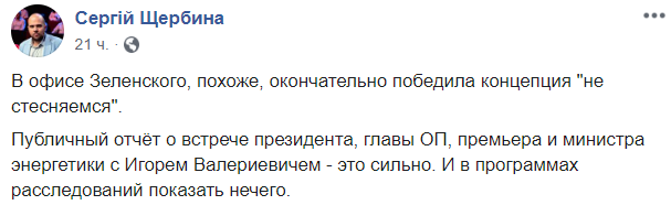 Публичный отчет о встрече президента, главы ОП, премьера и министра энергетики с Игорем Валериевичем – это сильно. И в программах расследований показать нечего".