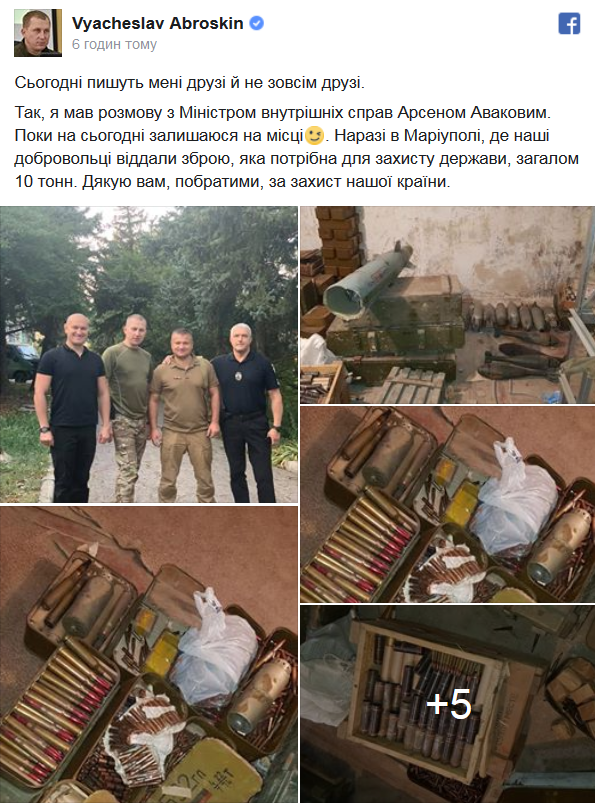 "Cегодня пишут мне друзья и не совсем друзья. Да, я разговаривал с министром внутренних дел Арсеном Аваковым. Пока на сегодня остаюсь на месте. Сейчас в Мариуполе, где наши добровольцы отдали оружие, которое необходимо для защиты государства, всего 10 тонн. Спасибо вам, собратья по защите нашей страны", - написал Вячеслав Аброськин.