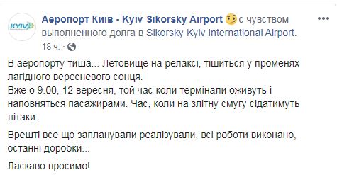 "В аэропорту тишина... Аэродром на релаксе, тешится в лучах ласкового сентябрьского солнца. Уже в 9.00, 12 сентября, терминалы оживут и наполнятся пассажирами. Время, когда на взлетную полосу будут садиться самолеты. В итоге все что запланировали - реализовали, все работы выполнены, последние доработки... Добро пожаловать!", - написали в Facebook представители аэропорта.