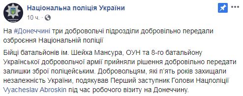 "Бойцы батальонов им. Шейха Мансура, ОУН и 8-го батальона Украинской добровольческой армии приняли решение добровольно передать оставшееся оружие полицейским", - говорится в сообщении. Отмечается, что добровольцев, которые пять лет защищали независимость Украины, поблагодарил первый заместитель председателя Нацполиции Вячеслав Аброськин во время рабочего визита в Донецкую область.