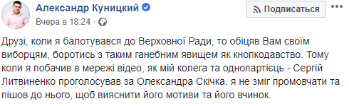 После того, как разгорелся скандал с Литвиненко, его однопартиец Александр Куницкий выложил видео, как он подошел к нардепу в Раде вовремя заседания и взял с него слово, что тот больше не будет.