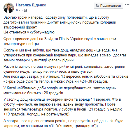 "В столице дождь наиболее вероятен ночью и утром 14 сентября. Кто в субботу женится, не переживайте, днем опять прояснится. Однако снизится температура воздуха, в субботу в Киеве +21 градус, в воскресенье +19 градусов... А завтра - все еще синоптическая роскошь, не пропустите этот день, он будет хорошим, несмотря на совпадение "пятница, тринадцатое"", - написала Наталья Диденко.