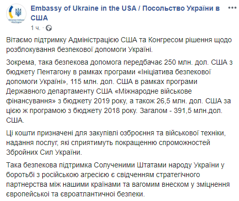 "Такая политика безопасности поддержки Соединенными Штатами народа Украины в борьбе с российской агрессией является свидетельством стратегического партнерства между нашими странами и весомым вкладом в укрепление европейской и евроатлантической безопасности", – подчеркнули в украинском посольстве.