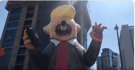 Грызун напоминает американского лидера белокурой шевелюрой и красным галстуком, а в лапке он держит мобильный телефон. Шар был поднят жителями города над улицей Президент-стрит. При этом на нем был стикер со словами "Борись с фашизмом, останови Трампа".