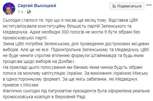 "Сегодня произошло то, о чем я писал еще месяц назад. Отставка ЦИК институциализировала конституционное большинство партий Зеленского и Медведчука. Ведь необходимые 300 голосов не могли быть собраны без промосковской партии.