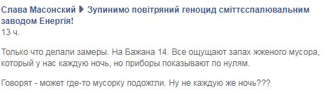 Некоторые жители Левобережья не выдержали и сами пошли делать замеры чистоты воздуха. "Только что делали замеры. На Бажана 14. Все ощущают запах жженого мусора, который у нас каждую ночь, но приборы показывают по нулям. Говорят - может где-то мусорку подожгли. Ну не каждую же ночь???", - пишет Слава Масонский в Facebook-группе "Зупинимо повітряний геноцид сміттєспалювальним заводом Енергія!"