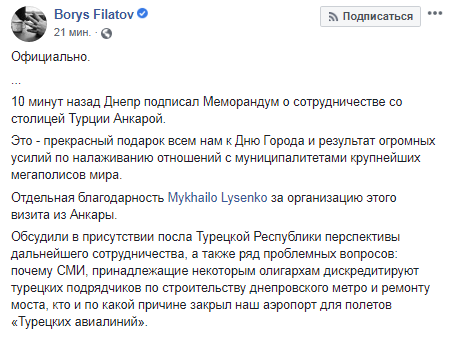 Официально мэр города рассказал, что Днепр подписал Меморандум о сотрудничестве со столицей Турции Анкарой. Также Борис Филатов добавил, что в присутствии посла Турецкой Республики обсуждались перспективы дальнейшего сотрудничества, а также ряд проблемных вопросов.