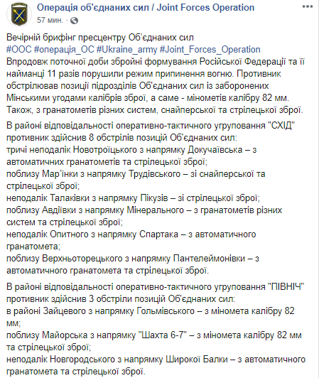 В частности, обстрелы восемь раз велись в районе ответственности оперативно-тактической группировки "Восток" и три раза в районе ответственности оперативно-тактической группировки "Север". Противник применял запрещенные Минскими соглашениями калибры оружия - минометы калибра 82 мм, а также гранатометы различных систем, снайперское и стрелковое оружие.