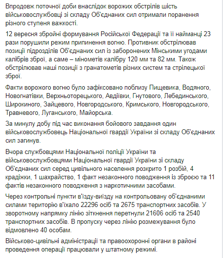 В течение суток 13 сентября сепаратисты 11 раз обстреляли украинские позиции на Донбассе, в результате были ранены шестеро военных.