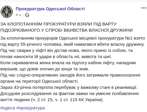 "Сейчас 43-летняя пострадавшая находится в тяжелом состоянии в реанимации. Досудебное расследование по факту покушения на умышленное убийство (ч. 2 ст. 15, ч. 1 ст. 115 УК Украины) продолжается", - сообщили в пресс-службе.