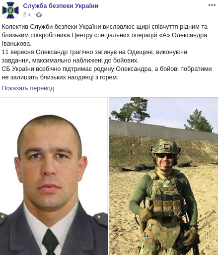 "Коллектив Службы безопасности Украины выражает искренние соболезнования родным и близким сотрудника Центра специальных операций «А» Александра Иванькова. 11 сентября Александр трагически погиб в Одесской области, выполняя задачи, максимально приближенные к боевым", - говорится в сообщении.