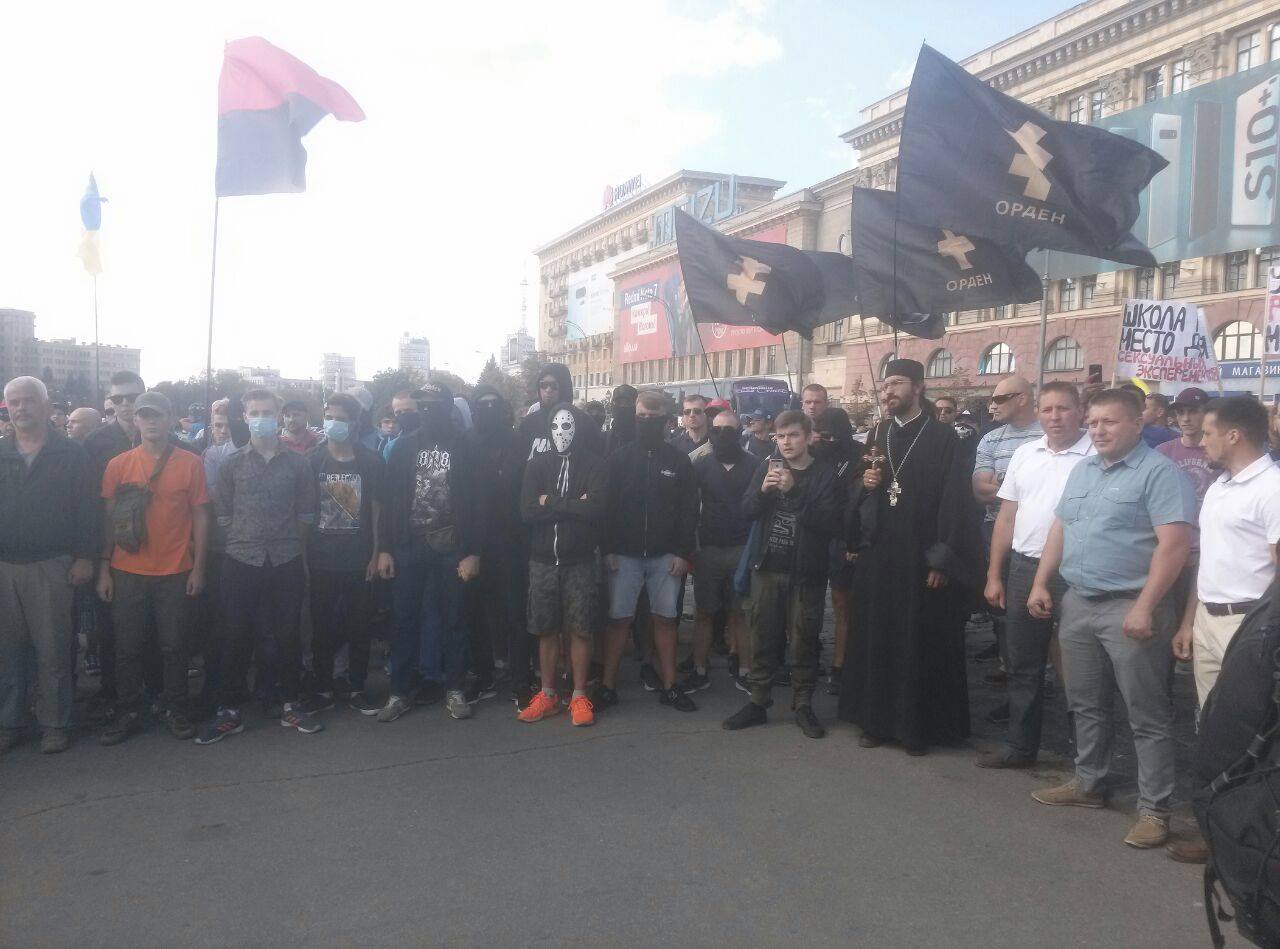 Радикалы объяснили, что белая маска, которую надели некоторые из них, - это "маска харьковчанина": якобы все жители города разделяют их ценности. Как передают местные СМИ, люди с закрытыми лицами выкрикивали традиционное приветствие националистов: "Слава Украине - героям слава".