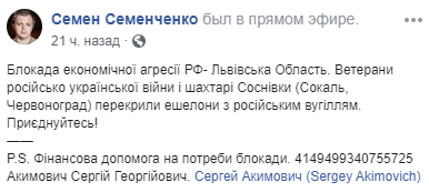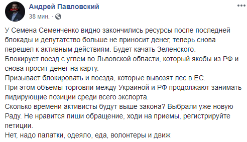 "У Семена Семенченко видно закончились ресурсы после последней блокады и депутатство больше не приносит денег, теперь снова перешел к активным действиям. Будет качать Зеленского. Блокирует поезд с углем во Львовской области, который якобы из РФ и снова просит денег на карту... Сколько времени активисты будут выше закона? Выбрали уже новую Раду. Не нравится пиши обращение, ходи на приемы, регистрируйте петиции. Нет, надо палатки, одеяло, еда, волонтеры и движ", - добавил он.