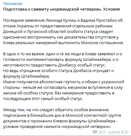 В одно и то же время, одни и те же люди в Киеве заявляют и о готовности имплементировать формулу Штайнмайера, и о неготовности предоставить Донбассу особый статус. Но ведь отрицание особого статуса Донбасса отрицает и формулу Штайнмайера. Иначе получается абсолютная глупость и обман с украинской стороны - нельзя же согласовать механизм вступления в силу закона об особом статусе, без намерения предоставить в последующем этот самый особый статус", - написал Чеснаков.