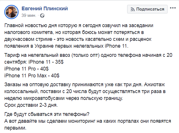 Плинский также написал, что заказы на оптовую доставку принимают уже три дня. При этом возник колоссальный ажиотаж: поставки с 20 сентября будут осуществляться три раза в неделю микроавтобусами через польскую границу. Срок доставки смартфонов - 2-3 дня.