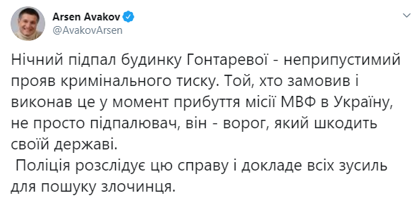 "Ночной поджог дома Гонтаревой - недопустимое проявление криминального давления. Тот, кто заказал и исполнил это в момент прибытия миссии МВФ в Украину, не просто поджигатель, он - враг, который вредит своему государству", - заявил министр.