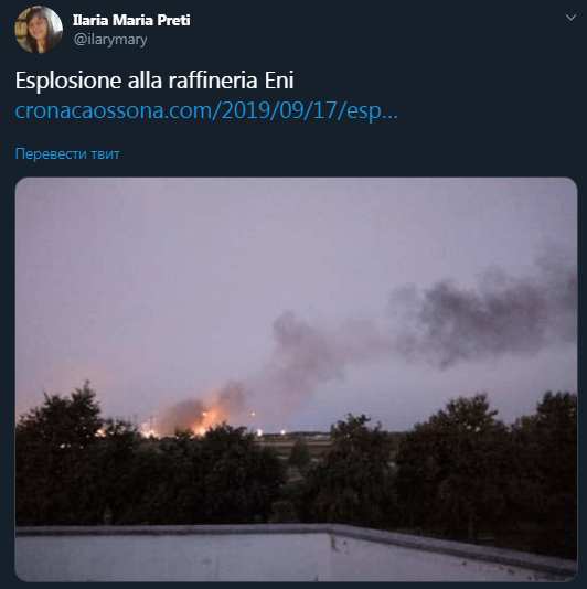 Дым поднялся до небес. В Италии произошел взрыв на нефтеперерабатывающем заводе. Фото