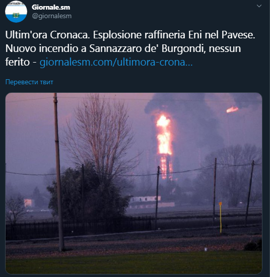 Сообщается, что инцидент произошел около 06:35 по местному времени (07:35 по киевскому) вблизи города Саннадзаро-де-Бургонди. Прогремевший взрыв привел к сильному пожару.