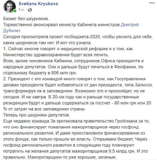 Заместитель главного редактора "Страны" Светлана Крюкова не разделяет восторженного заявления Дубилета. Она проанализировала госбюджет и выяснила, что себя слуги народа никоим образом не обделили: чиновники Кабмина, сотрудники Офиса президента и народные депутаты и дальше будут лечиться в Феофании, по отдельному бюджету в 806 млн грн.