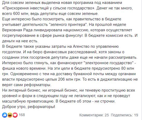 Интересно было глянуть, как финансируют "электронное государство" - фишка нового времени. На эти цели в бюджете предусмотрено 80 млн грн... Ни янтарный бизнес, ни игорный бизнес, ни теневую проституцию всех уровней и форм в следующем году не легализуют, как и не проведут масштабную приватизацию. В бюджете об этом - ни строчки.