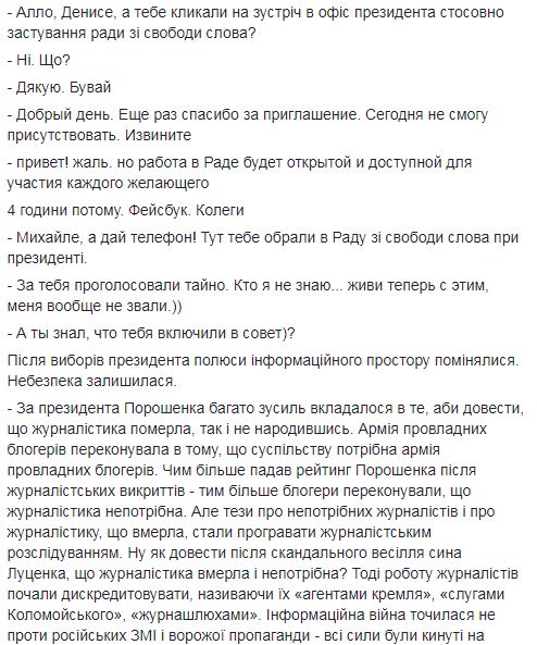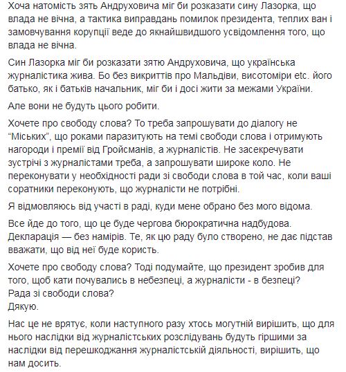 "Я отказываюсь от участия в совете, куда меня избрали без моего ведома. Все идет к тому, что это будет очередная бюрократическая надстройка. Декларация без намерений. То, как этот совет был создан, не дает оснований считать, что от нее будет польза", - отметил журналист.