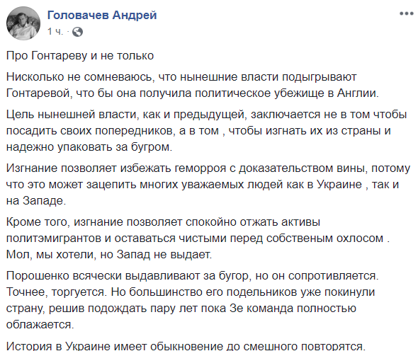 Блогер Андрей Головачев также придерживается версии, что дом Гонтаревой действительно сожгли ее оппоненты. С целью оставить экс-главу Нацбанка за границей и не мучаться с доказательством ее вины.
