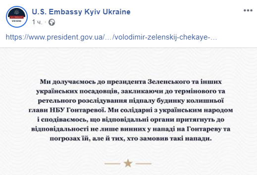 "Мы присоединяемся к президенту Зеленскому и другим украинским должностным лицам, призывая к срочному и тщательному расследованию поджога дома бывшей главы НБУ Гонтаревой. Мы … надеемся, что компетентные органы привлекут к ответственности не только виновных в нападении на Гонтареву и угрозах ей, но и тех, кто заказал такие нападения", - говорится в сообщении диппредставительства США в твиттере.