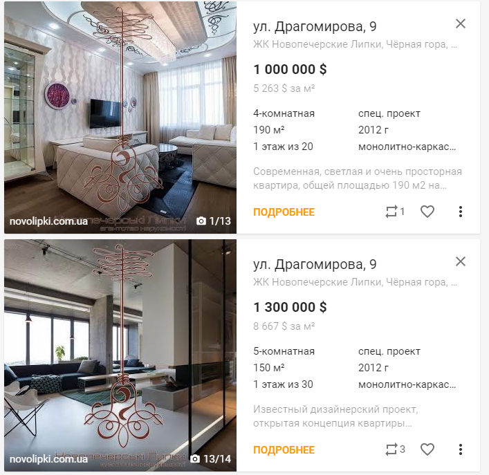 "Страна" узнала, что эта квартира находится в элитном жилом комплексе "Новопечерские Липки" на улице Драгомирова, 9. По сведениям одного из порталов о недвижимости, квартиры даже меньшей площадью продаются в этом здесь по ценам от 1 миллиона долларов США: