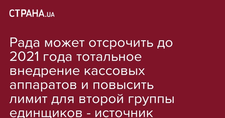Правительство и бизнес договорились, что поправки ко второму чтению законопроектов о фискализации расчетных операций и о "кэшбеке" будут предусматривать отсрочку введения кассовых аппаратов с 2020 года на 2021 год и повышение годового лимита дохода для второй группы плательщиков единого налога с нынешних 1,5 миллиона гривен до 2,5 миллиона гривен.