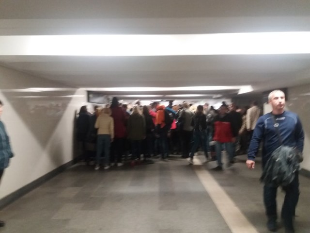Очередь из людей вытянулась от входа на станцию в подземный переход. А в кассовом зале образовалась давка.