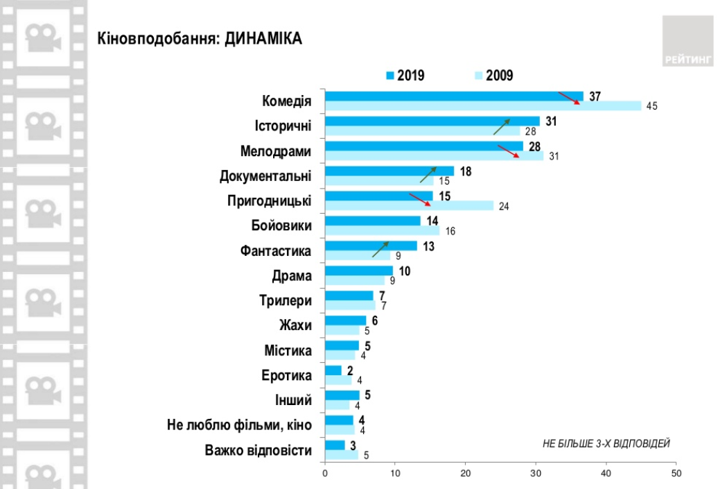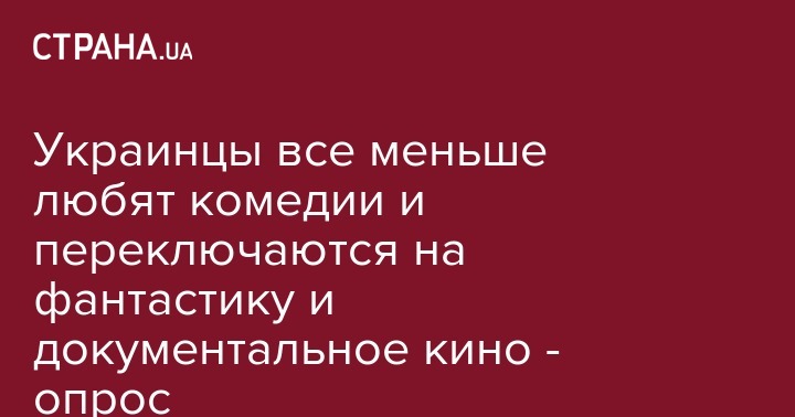 Комедии остаются любимым жанром кино украинцев, но процент любителей посмеяться перед экраном уменьшился за десятилетие с 45% до 37%. Об этом свидетельствуют данные опроса, проведенного Социологической группой "Рейтинг" в сентябре 2019 года.