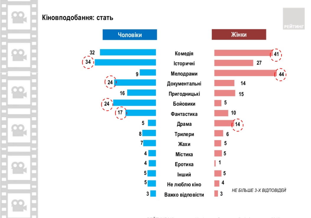Кинопредпочтения заметно отличаются по полу. Так, женщины почти в пять раз больше, чем мужчины любят мелодрамы (женщины - 44%, а мужчины - 9%), также в три раза больше мужчин они любят драмы (14% и 5% соответственно). Также женщинам больше, чем мужчинам нравится комедии (41% и 32%). А представителям мужского пола в пять раз больше, чем женщинам нравятся боевики (24% - мужчины и 5% - женщины). Им же больше нравится исторические (34% - мужчины, 27% - женщины), документальные (24% и 14% соответственно) и фантастические фильмы (17 и 10%).