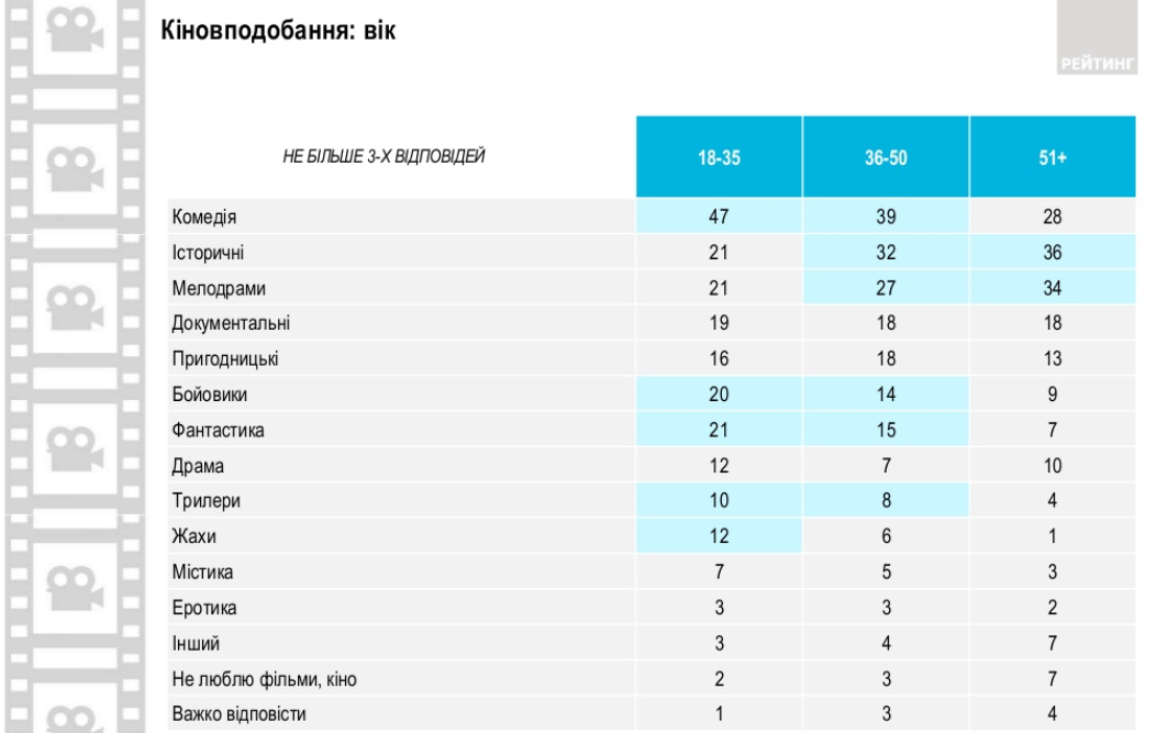 Вкусы украинцев в выборе фильмов также отличаются по уровню образования. Так, чем выше уровень образования, тем больше любят исторические, документальные фильмы и фантастику. Также представители с высшим образованием больше, чем другие любят комедии, приключенческие фильмы и триллеры. Людей со средним образованием больше остальных интересуют боевики и мелодрамы.