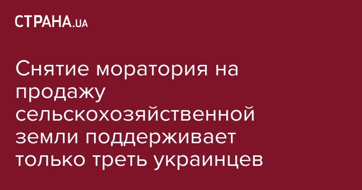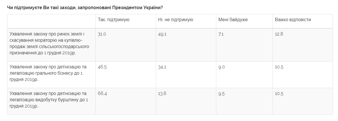 Как сообщается на сайте Центра Разумкова, принятие закона о рынке земли и отмене моратория на куплю-продажу земли сельскохозяйственного назначения до 1 декабря 2019 года поддерживает 31% опрошенных. Не поддерживает эту инициативу 49,1%.