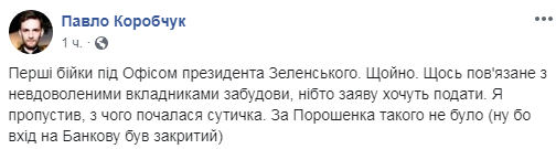 По данным на фб-странице Павла Коробчука, недовольные инвесторы застройки якобы хотели подать заявление президенту Владимиру Зеленскому. Около 300 инвесторов недостроенных жилых домов в Киеве требуют от властей выделить финансирование на завершение строительства жилищных комплексов.