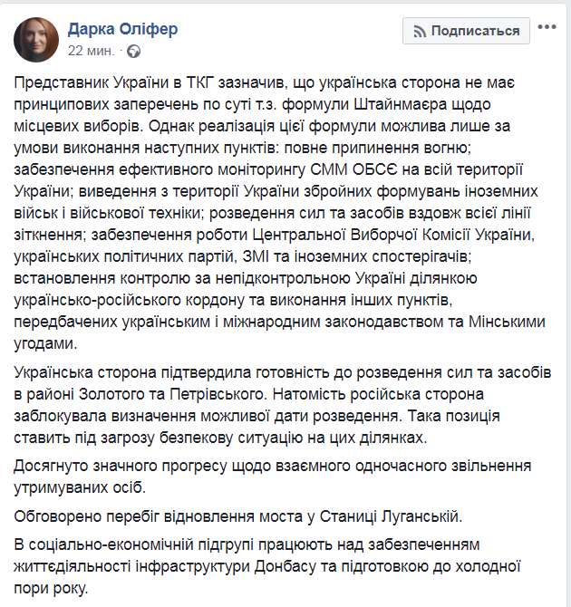 "Представитель Украины в ТКГ отметил, что украинская сторона не имеет принципиальных возражений по существу т.н. формулы Штайнмайера о местных выборах. Однако реализация этой формулы возможна только при условии выполнения следующих пунктов: полное прекращение огня; обеспечение эффективного мониторинга СММ ОБСЕ на всей территории Украины; вывод с территории Украины вооруженных формирований иностранных войск и военной техники; разведение сил и средств вдоль всей линии соприкосновения; обеспечение работы Центральной избирательной комиссии Украины, украинских политических партий, СМИ и иностранных наблюдателей; установление контроля над неподконтрольных Украине участках российско-украинской границы и выполнение других пунктов, предусмотренных украинским и международным законодательством и минский соглашениями", - написала пресс-секретарь.