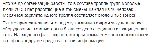 "В составе тролль-групп молодые люди 20-30 лет работающие в три смены, каждая из 10 человек. Месячная зарплата одного тролля составляет около 9 тыс гривен", - писал блогер. Норма дневной смены - 300 комментариев, ночной – 200 комментариев, добавил он.