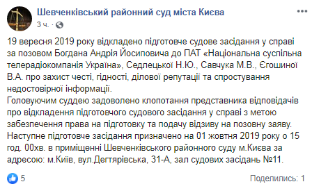 "19 сентября 2019 отложено подготовительное судебное заседание по иску Богдана Андрея Иосифовича к ОАО "Национальная общественная телерадиокомпания Украины", Седлецкой Н.Ю., Савчуку М.В., Егошину В.А. о защите чести, достоинства, деловой репутации и опровержении недостоверной информации", - сказано в сообщении.