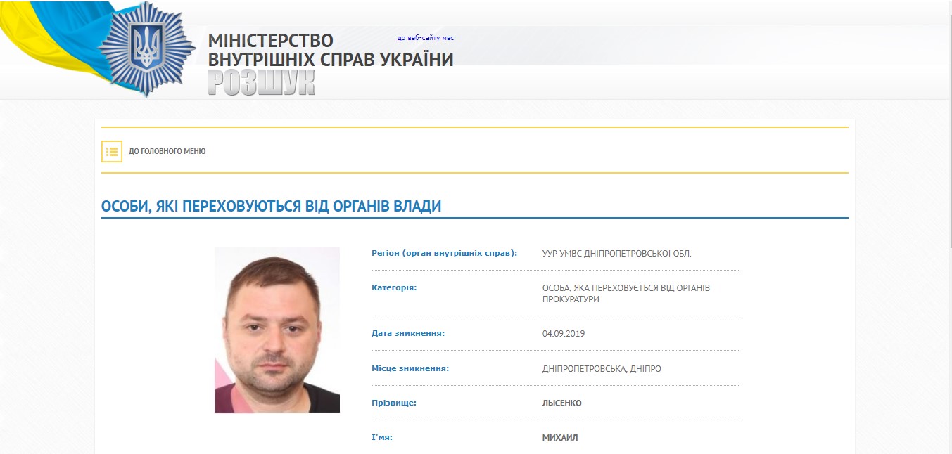 На сайте МВД появилась информация о розыске подозреваемого в хищении заммэра Днепра Лысенко