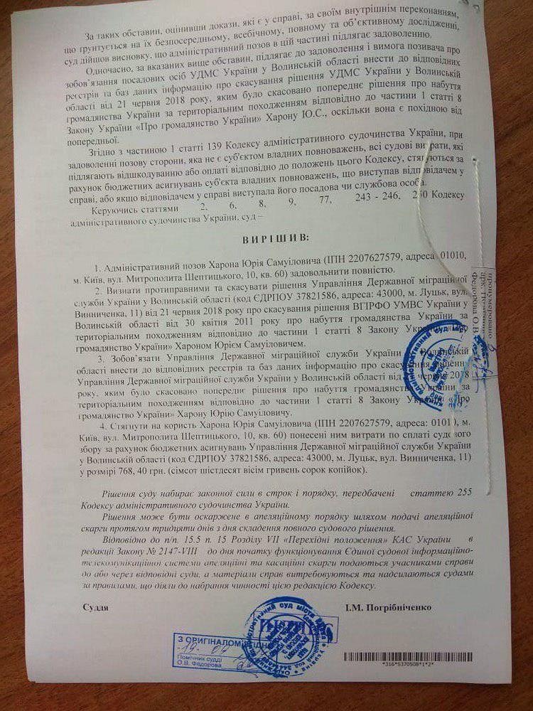Отмечается, что суд обязал должностных лиц Управления Государственной миграционной службы в Волынской области внести в соответствующие реестры информацию об отмене решения о лишении гражданства Харона и возместить ему денежные затраты на судебный сбор.