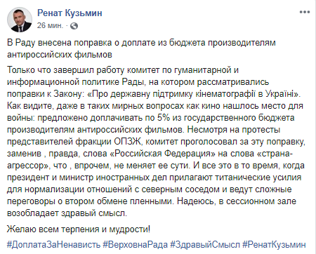 "Как видите, даже в таких мирных вопросах как кино нашлось место для войны: предложено доплачивать по 5% из государственного бюджета производителям антироссийских фильмов. Несмотря на протесты представителей фракции ОПЗЖ, комитет проголосовал за эту поправку, заменив, правда, слова "Российская Федерация" на слова "страна-агрессор", что, впрочем, не меняет ее сути", - написал Кузьмин.
