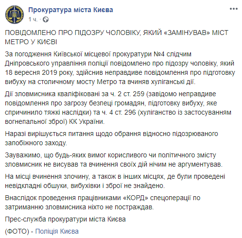 Экс-атошнику Алексею Белько, который вечером 18 сентября под действием наркотиков угрожал взорвать мост Метро в Киеве, сообщили о подозрении. Об этом сообщает прокуратуры Киева на своей странице в соцсети.