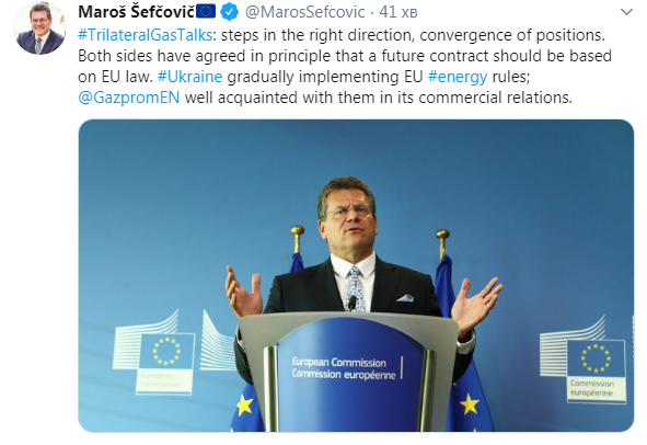 Прошедшие трехсторонние переговоры (Украина-Россия-ЕК) выявили общее понимание принципов заключения нового контракта на транзит российского газа по территории Украины. Он должен основываться на законодательстве ЕС. Об этом сообщается в четверг, 19 сентября, в твиттер-микроблоге вице-президента Еврокомиссии Мароша Шефчовича.