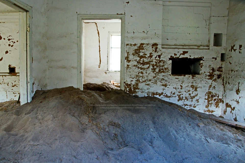 По словам сотрудников, во время последней экспедиции по зоне они заметили кучи вырытого песка вокруг крыльца одного из покинутых домов. Это была работа барсуков. Внутри помещения визитеров ждала еще более грандиозная картина: на полу дома были целые сугробы песка, который барсуки при строительстве жилья вынесли из-под пола и фундамента.